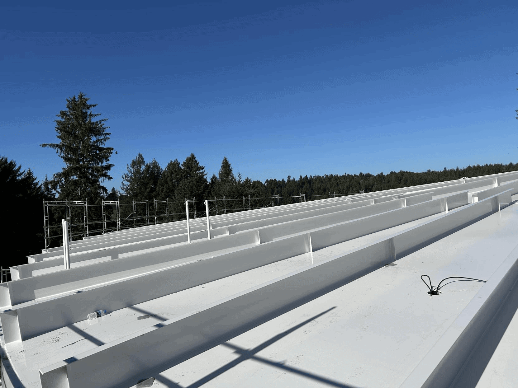 This seismic retrofit project included removal of the existing roof, structure, appurtenances, and the top two feet of shell plate. A new shell ring and two-bay external press-brake formed roof were installed with supporting columns and an open halo support system. The press-brake rafter configuration provides strong structural capacity without internal roof obstructions, improving access, maintenance, and service life. Work also included new roof appurtenances, baffle and cathodic protection systems, shell reinforcement plates, and accommodation of existing penetrations and anchors.