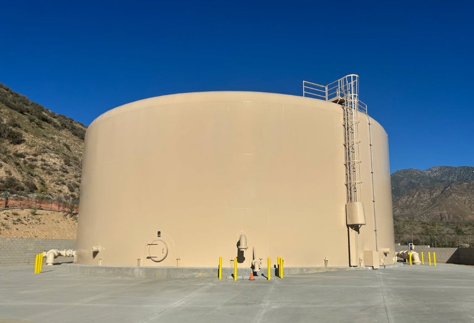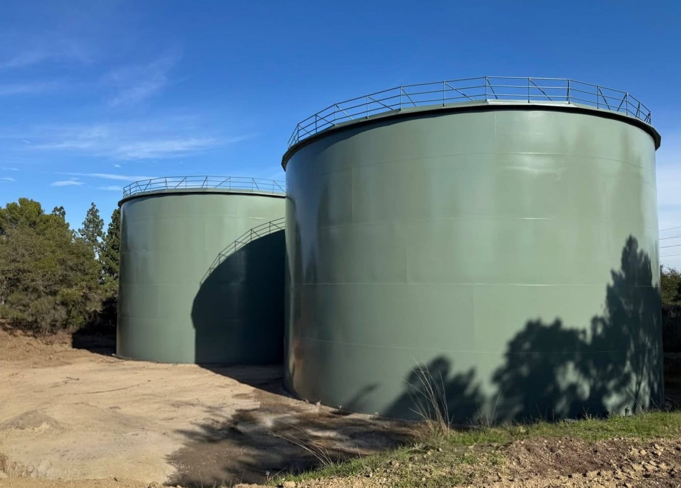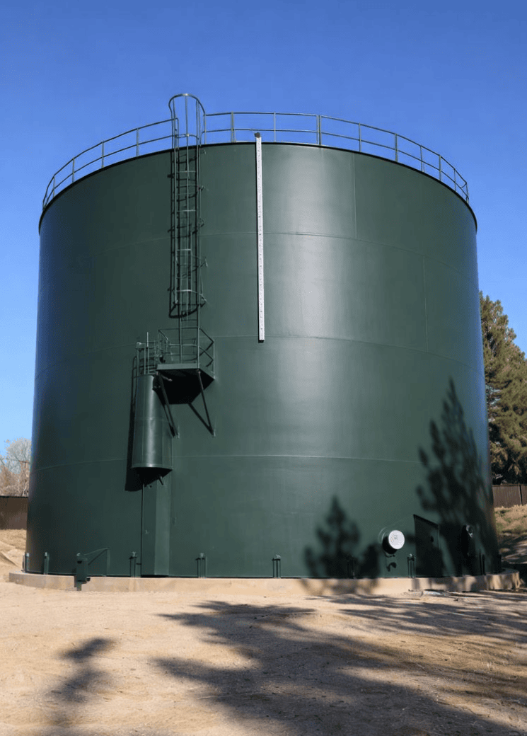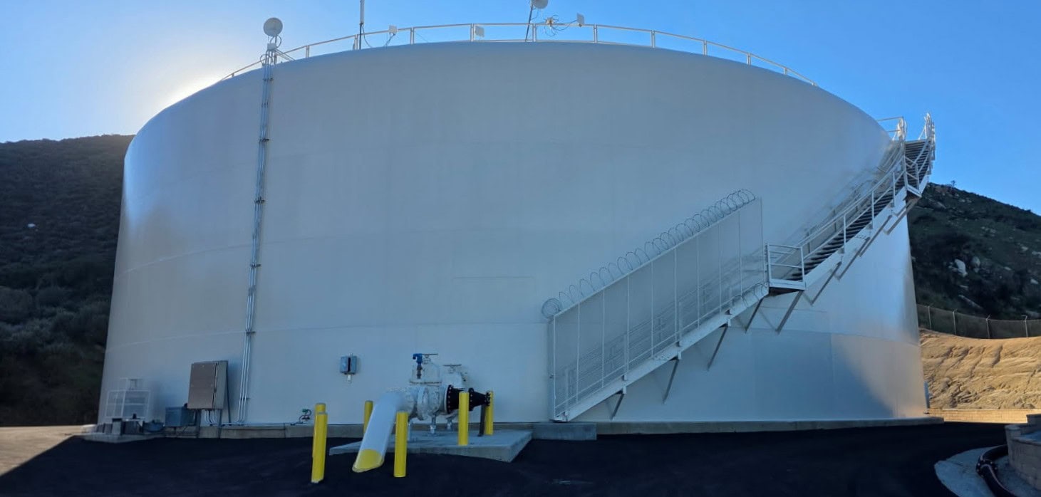 This two-tank expansion project in northern California added two matching 1.4-million-gallon welded carbon steel storage tanks, increasing system capacity and redundancy. The tanks feature identical spiral staircases and aluminum dome roofs that provide a clear-span, column-free interior to support water quality. Welded steel construction enabled efficient field erection and long-term durability, while the lightweight aluminum dome roofs offer corrosion resistance and strong performance under wind and seismic loads. Custom exterior coatings allow the tanks to blend into the surrounding landscape.